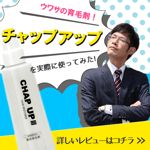 チャップアップは育毛・発毛促進効果のある有効成分3種(センブリエキス、グリチルリチン酸ジカリウム、塩酸ジフェンヒドラミン)配合に加え、55種類の植物エキスと15種類のアミノ酸を独自監修で配合した使用感満足度99.1%の日本で一番売れた育毛剤です。当サイトの総合ランキングでも堂々一位に選ばれた超おすすめ育毛剤です。